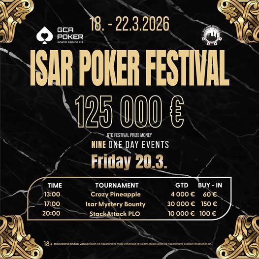Im Grand Casino As (GCA) gastiert momentan das Isar Poker Festival powered by Isar Poker München e.V. Es läuft noch bis zum 22. März und bietet insgesamt neun One Day Events mit garantierten €125.000. Am gestrigen Donnerstag ging es weiter mit dem €53+7 Noon Turbo (€3.000 GTD) und dem €60+10 Isar Warm Up (€8.000 GTD).