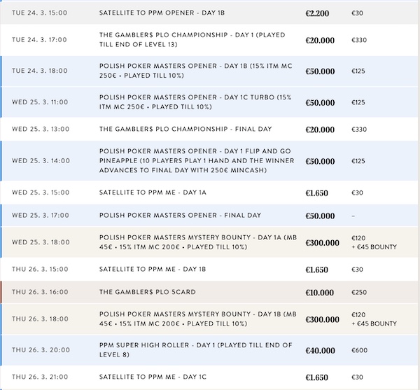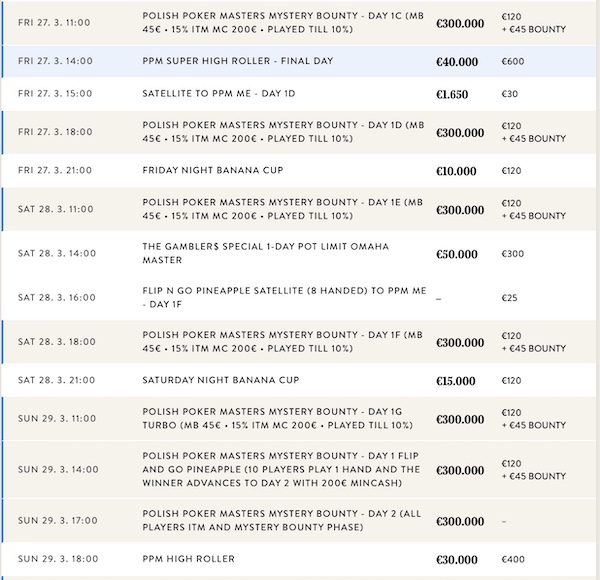 Sieben Starttage stehen im Angebot und dazu kommt noch ein Flip & Go. Alle Überlebenden werden am Sonntag, den 22. März um 17:00 Uhr an die Tische zurückkehren und das finale wird am Montag, den 23. März ausgetragen.