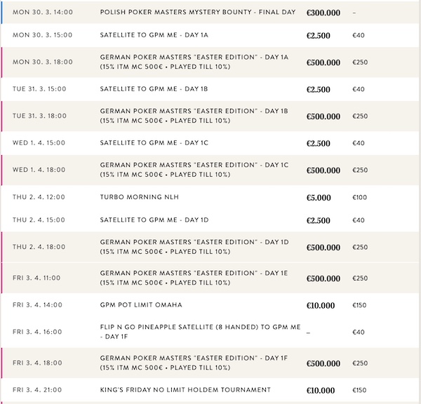 Im King’s Casino Prag wurde derweil auch gepokert. Hier nahmen 44 Spieler an den Tischen Platz und bezahlten für weitere 26 Re-Entries. Dies reichte nicht aus, die Garantie zu übertreffen und so wurde um €10.000 gespielt.