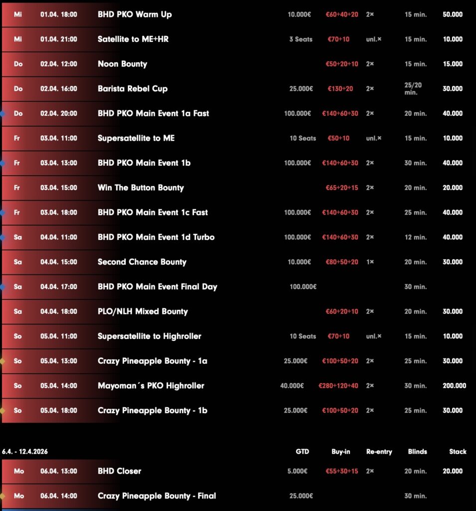 Aber natürlich finden im Laufe des Festivals noch diverse Side Events im GCA Pokerroom 2.0 statt. Besonders hervorzuheben sind da zum Beispiel das €60+40+20 BHD PKO Warm Up (€10.000 GTD) gleich am Anfang am 1. April, das €130+20 Barista Rebel Cup Turnier (€25.000 GTD) am 2. April, das €65+20+15 Win The Button Bounty am 3. April, das €100+50+20 Crazy Pineapple Bounty (€25.000 GTD) mit zwei Starttagen am 5. April und dem Finale am 6. April und dem €55+30+15 BHD Closer (€5.000 GTD) am 6. April.