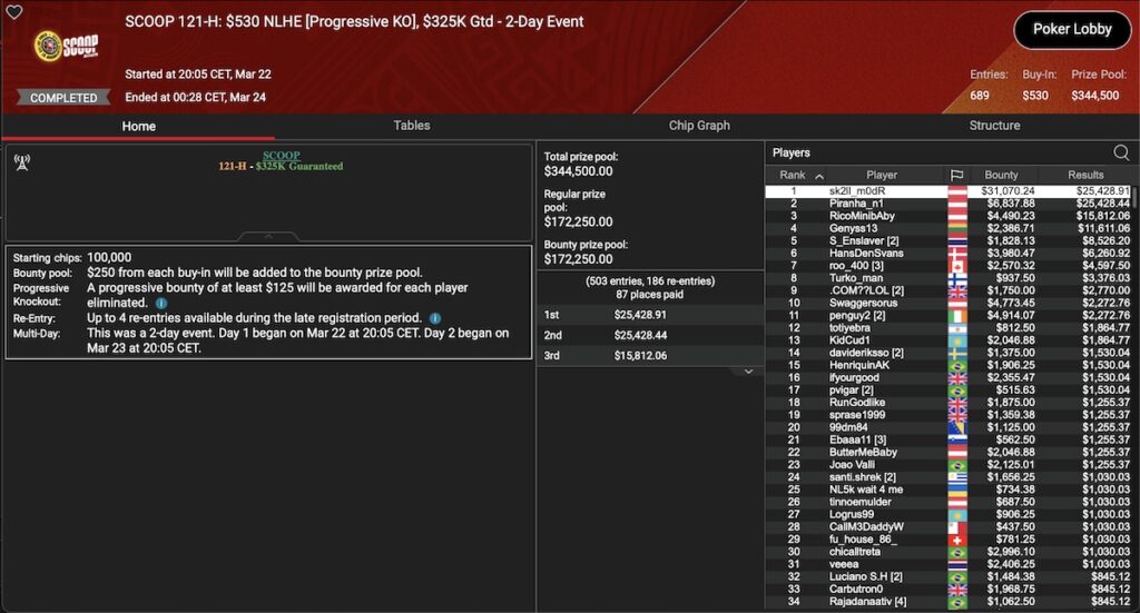 Das SCOOP 121-H: $530 PKO wurde von einem Dreier-Pack von Österreichern gewonnen. ‚RicoMinibAby‚, ‚Piranha_n1‚ und ‚sk2ll_m0dr‚ setzten sich in diesem Turnier an die Spitze. Letzterer nahm dafür den Top-Preis von $25.428 und knackige $31.070 an Bounties mit nach Hause.