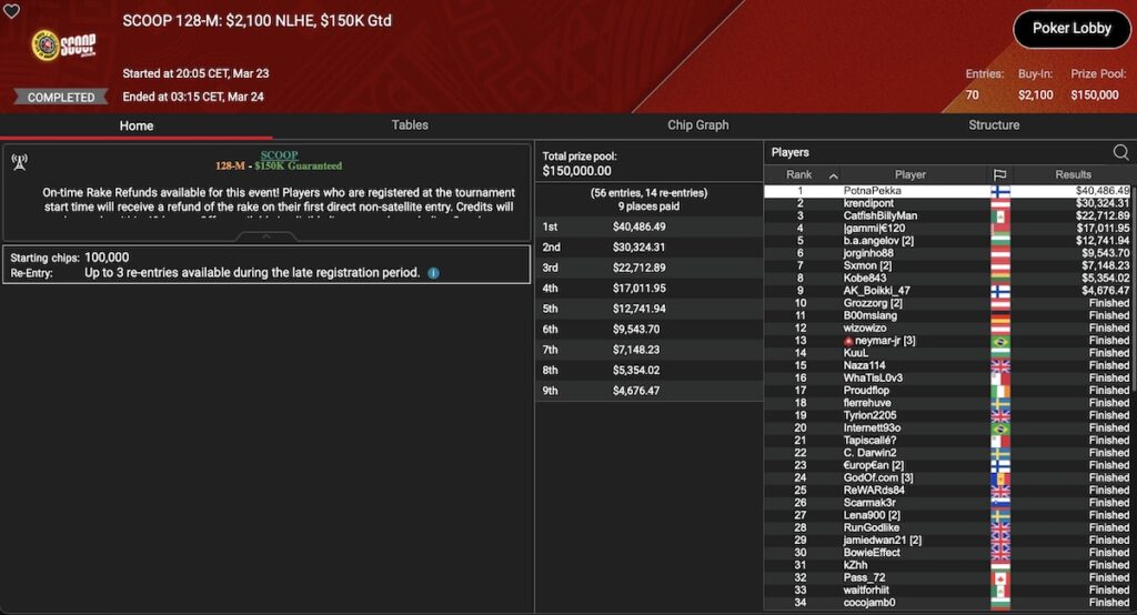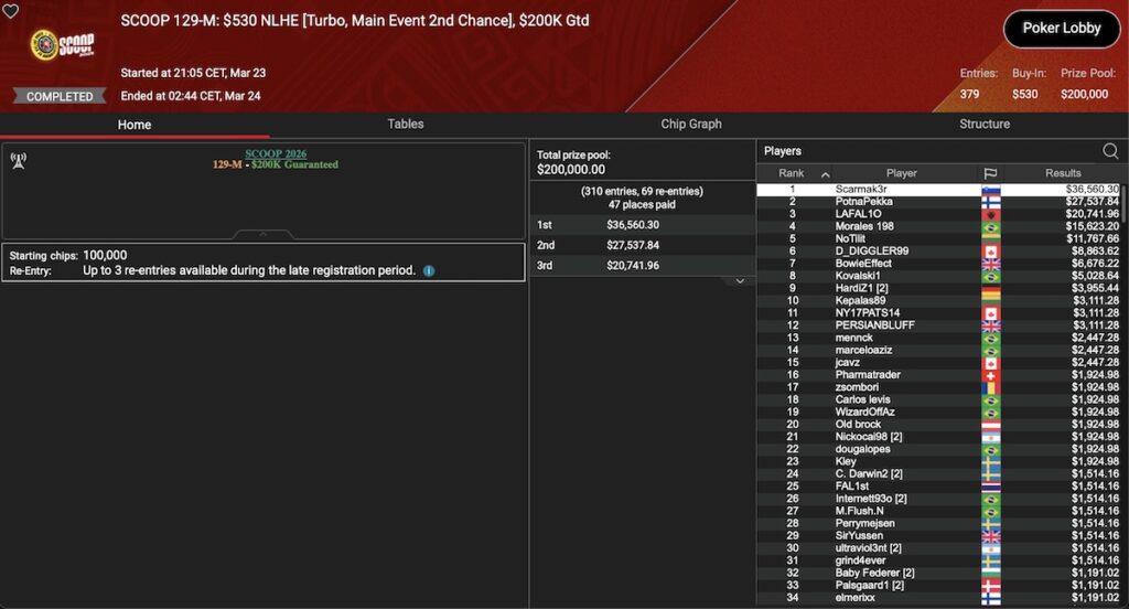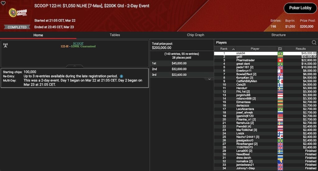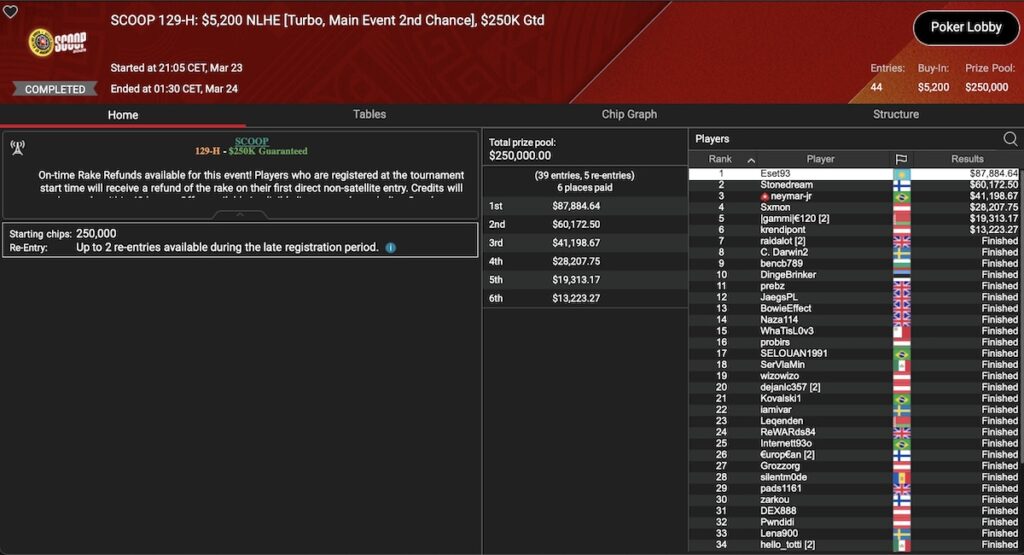 Im Event 129 gab es keine DACH-Spielre auf den Podiumsplätzen, aber es ist zu erwähnen, das der slowenische Superstar Blaž ‚Scarmak3r‘ Žerjav im SCOOP 129-M: $530 NLHE Main Event 2nd Chance den Sieg heimfahren konnte. Währenddessen schaffte es im SCOOP 129-H: $5.200 NLHE Main Event 2nd Chance ein anderer Superstar auf Platz 3 mit ‚neymar-jr‚.