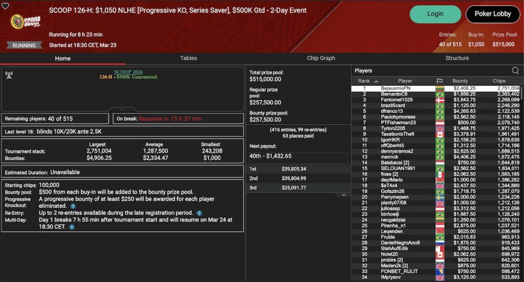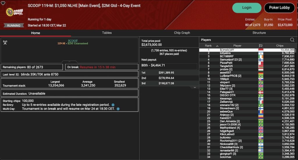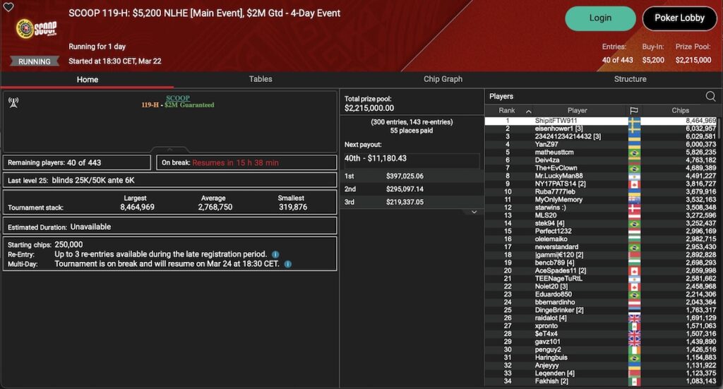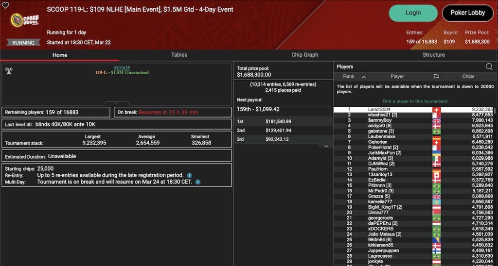 Die Main Events sind gestartet mit dem SCOOP 119-L: $109 NLHE Main Event, dem SCOOP 119-M: $1.050 NLHE Main Event und dem SCOOP 119-H: $5.200 NLHE Main Event. Alle drei Turniere sind 4-Tages-Events, es gibt also noch keine Sieger zu vermelden. In der Low-Variante hat mit ‚Lanor2004‘ ein Schweizer momentan die Nase vorn.