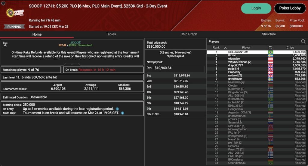 Das SCOOP 127-H: $5.200 PLO 6-Max Main Event war nicht mal das größte Event des gestrigen Spieltages. Hier verbleiben neun Spieler aus dem ursprünglichen 76 Entries für das heutige Finale. Aus DACH-Sicht haben wir noch Ole ‚wizowizo‘ Schemion und ‚WhySoS€rious‘ im Rennen um den $119.975 Top-Preis.