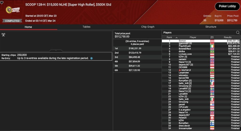 Event 128 mit dem SCOOP 128-M: $2.100 NLHE und dem saftigen SCOOP 128-H: $15.000 NLHE fanden gestern ihre Champions. Dabei haben wir einen österreichischen zweiten Platz im der Mid-Variante mit ‚krendipont‚ und einen Sieger in der High-Variante mit ‚Sxmon‚.