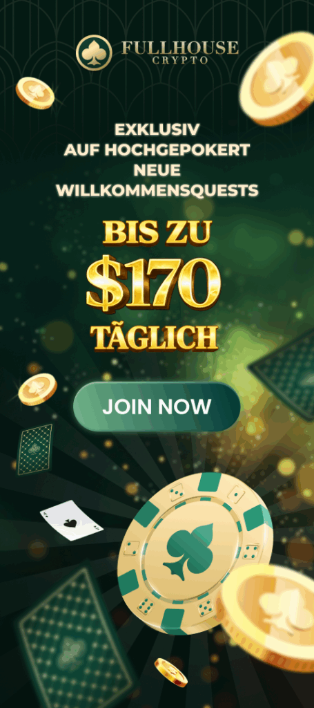 Mit einer zeitlich begrenzten Aktion startet FullHouse Crypto (FHC) eine exklusive Promotion für Leser von Hochgepokert. Im Mittelpunkt stehen dabei neue „Welcome Quests“, die nach der ersten Einzahlung aktiviert werden und über tägliche Aufgaben funktionieren.