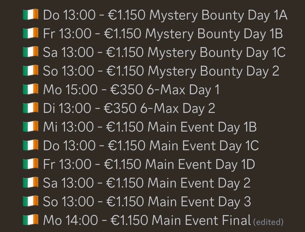 | 12:00 | Irish Open Main Event – €2,500,000 Guaranteed – Day 1/C | € 1.150 | 50.000 | 45 mins | Single Re-Entry per Flight |