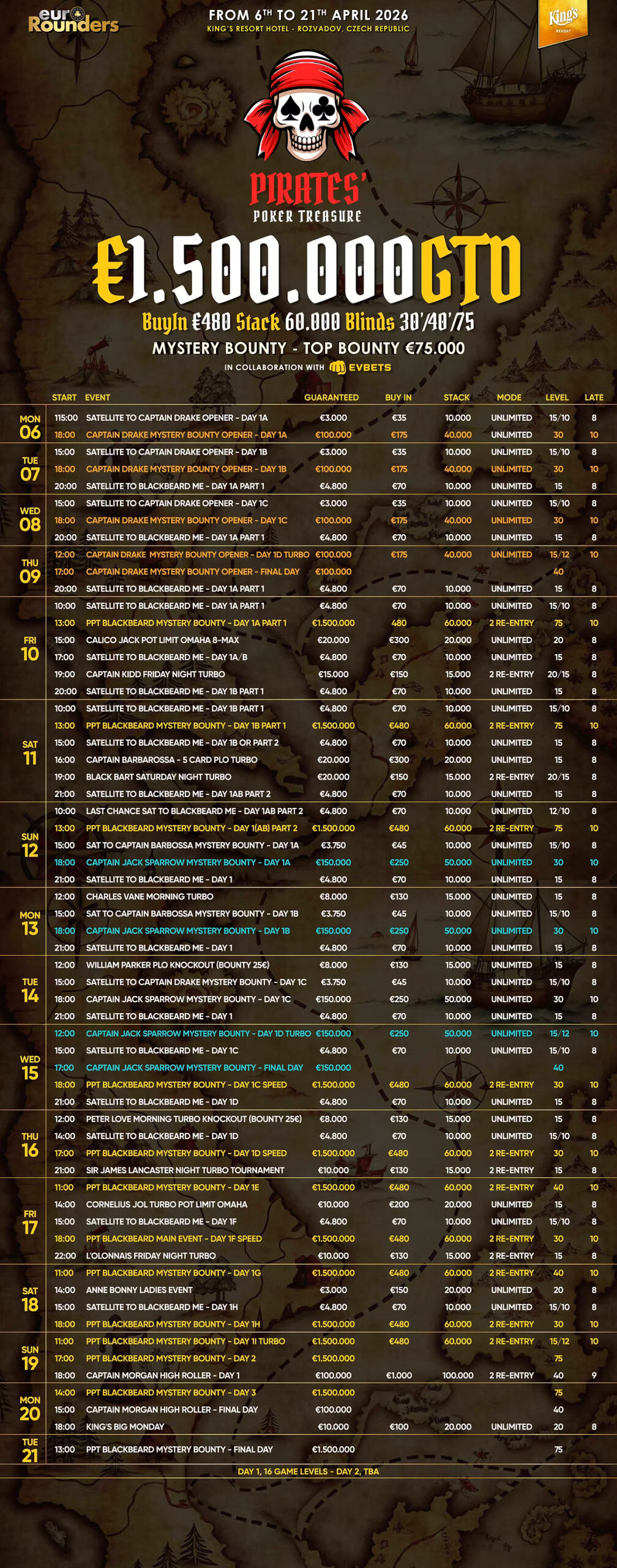 Das Pirates Poker Treasure Blackbeard Mystery Bounty mit einem Buy-In von €330+150 ist das Kernstück und bietet insgesamt neun Starttage plus die obligatorischen Flips.
