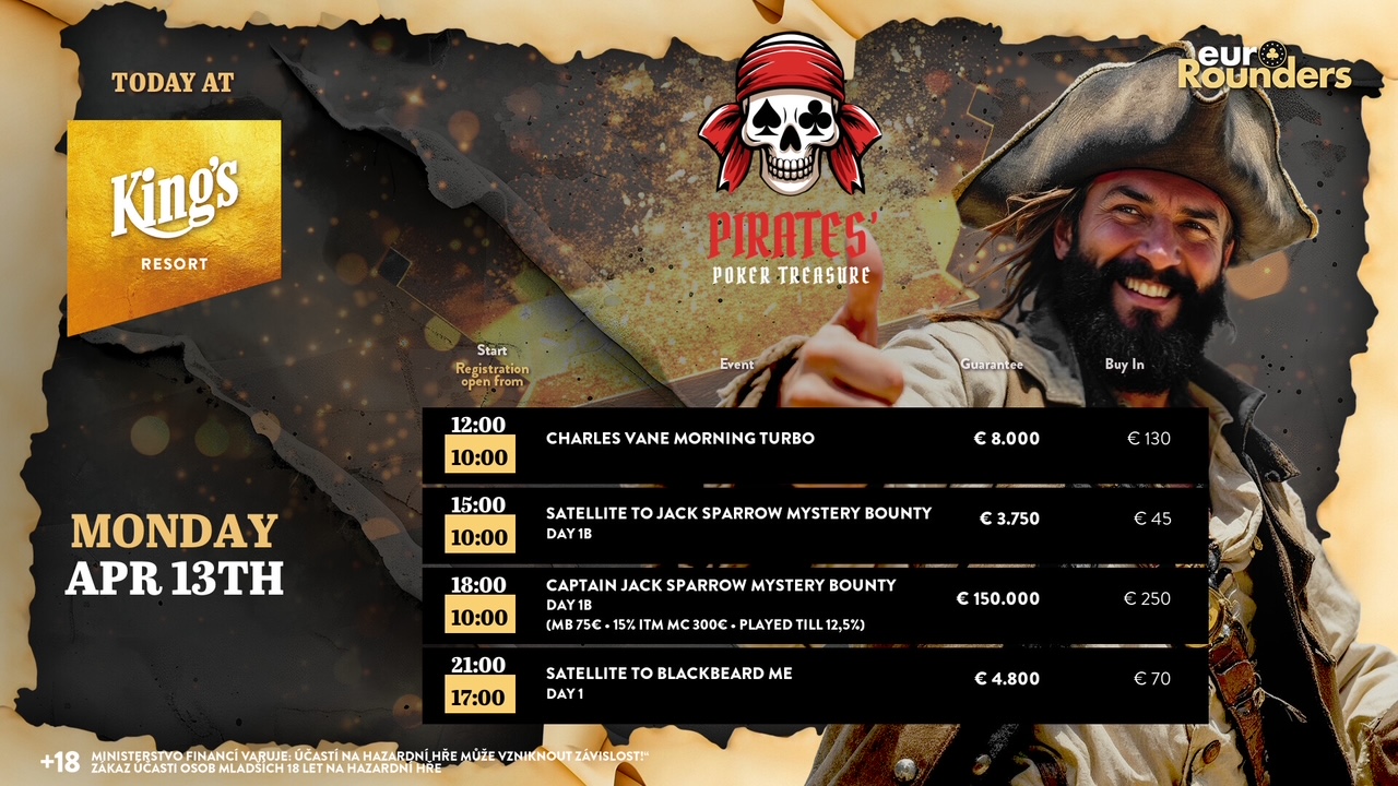 Im King’s Resort Rozvadov wurde Rahmen vom Pirates‘ Poker Treasure (PPT) Festival powered by euroRounders das €250 Mystery Bounty der Teil 2 der Startflights 1a/b gespielt. €1.500.000 werden in dem Turnier garantiert.