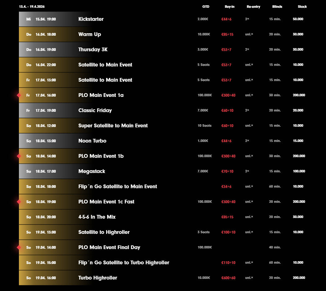 Im Rahmenprogramm wird neben dem €85+15 PLO Warm-Up außerdem eine Reihe von NLHE-Turnieren angeboten. Nicht fehlen dürfen dabei das €60+10 Classic Friday, das €70+10 Megastack am Samstag und das €600+60 Turbo Highroller am Sonntagnachmittag.