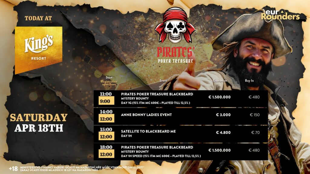 Die Seeräuber im King’s Resort Rozvadov gingen am Freitag auf Schatzsuche in den Cornelius Jol Turbo Pot Limit Omaha und L’Olonnais Friday Night Turbo Side Events. Im Rahmen der Pirates‘ Poker Treasure powered by euroRounders wurden die Beutegarantieren ganz klar übertroffen. Keiner der Likedeeler war gestern an einer Teilung interessiert und so kehrten die Vitualienbrüder teils mit reicher Beute von ihren Kaperfahrten zurück. – Im King’s Casino Prague ging es dagegen nicht um Piratenschätze, sondern um mindestens 1 Million Kronen. In dem Multi-Flight Event mit dem 1.000.000 CZK (40.000 EUR) garantierten Preispool wurde Starttag 5 von 8 gespielt.