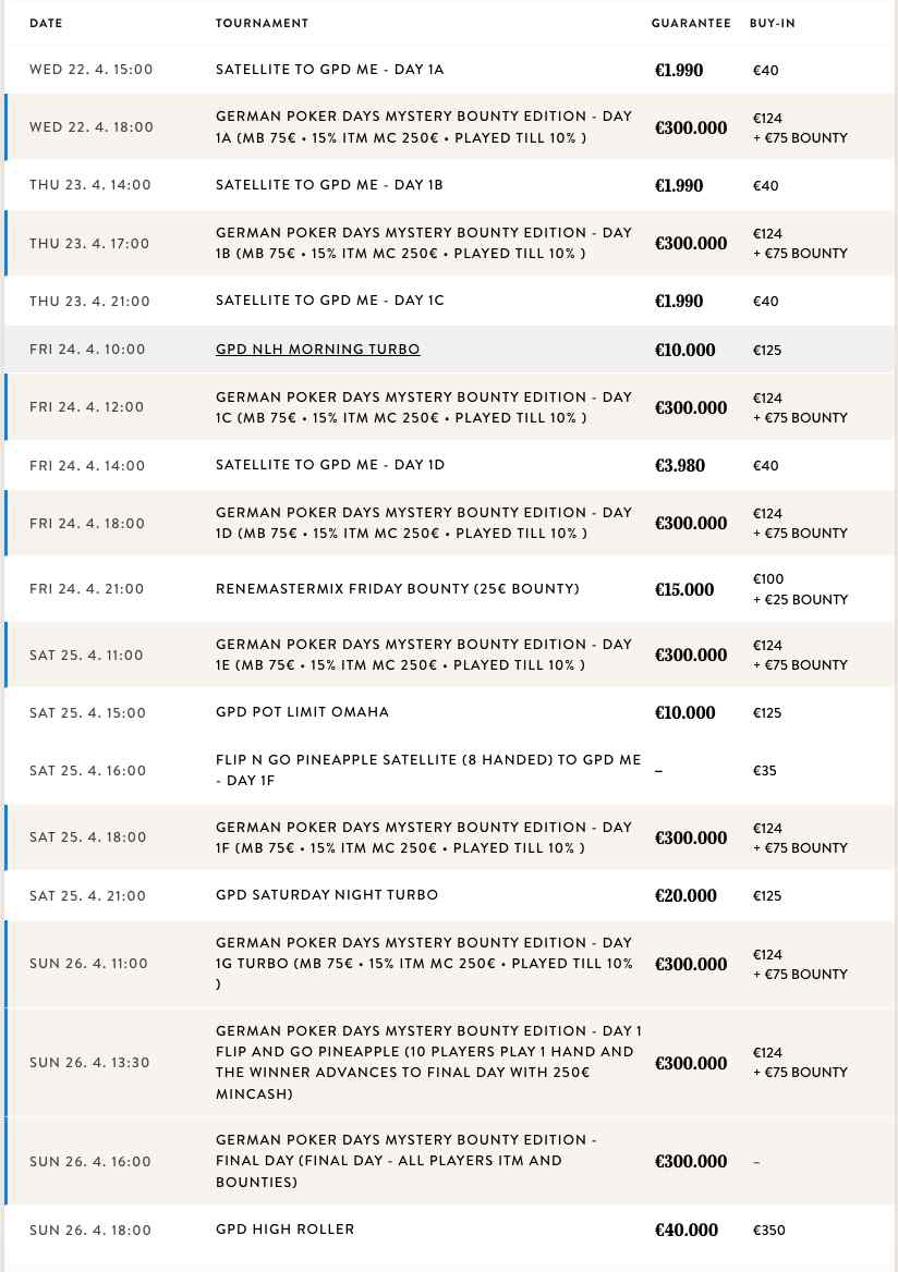 Dazu kommen etliche Side-Events, die nochmal €100.000 an Preisgeldern raushauen. Das größte Turnier davon ist das €350 GPD Highroller mit €40.000 Garantie.