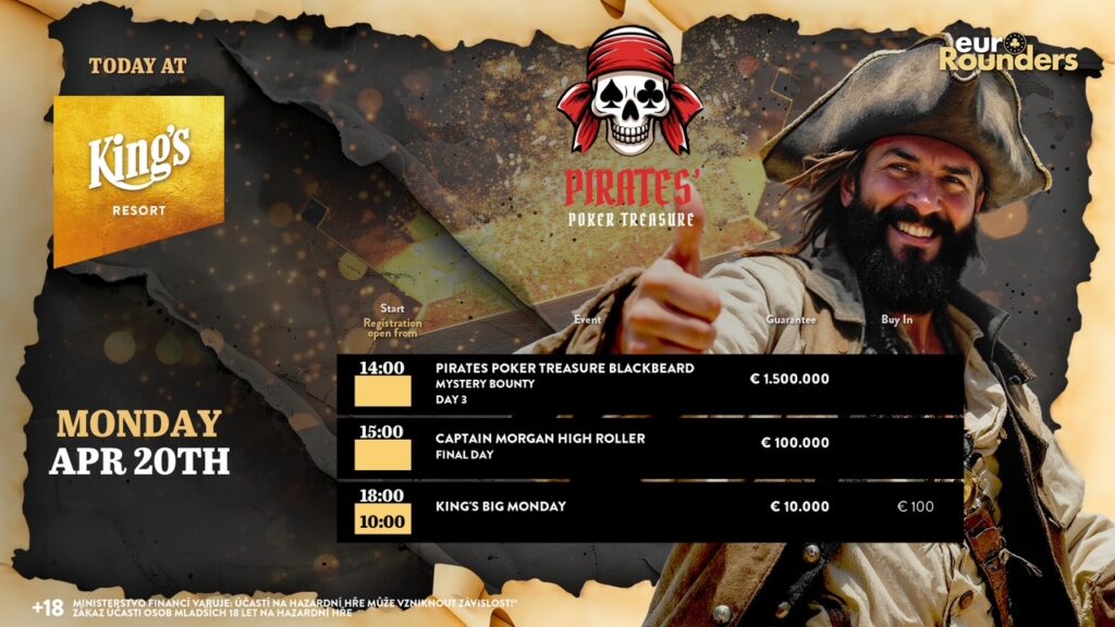 Im King’s Resort Rozvadov stand nach dem Turbo Starttag 1I und dem anschließenden Flip and Go fest, dass es trotz 2.785 Entrys ein Overlay im €480 Blackbeard Mystery Bounty, dem Main Event der Pirates‘ Poker Treasure (PPT) powered by euroRounders geben sollte. Die 75 Überlebenden werden heute am die größeren Payjumps aus dem €857.250 schweren regulären Teil des Preispools mit €120.600 Siegprämie, sowie um die Mystery Bountys aus dem €417.500 Bounty Pool mit einer Top-Bounty von €75.000 spielen.