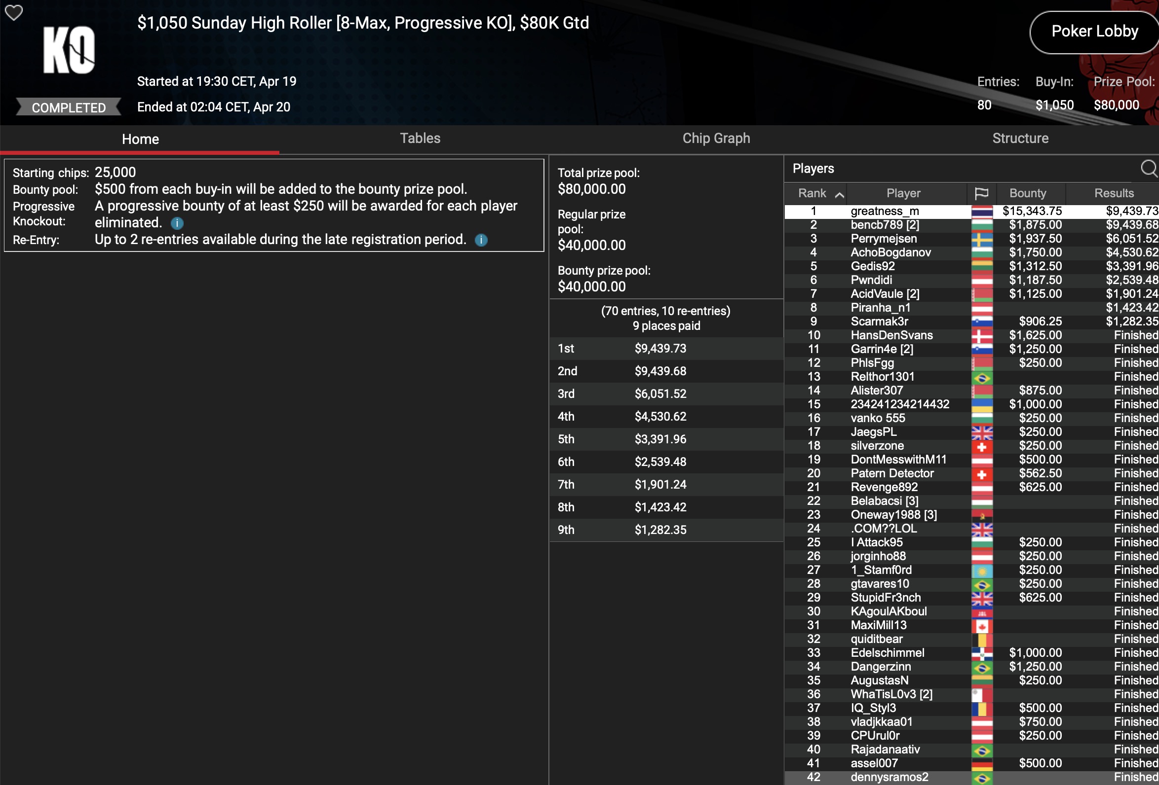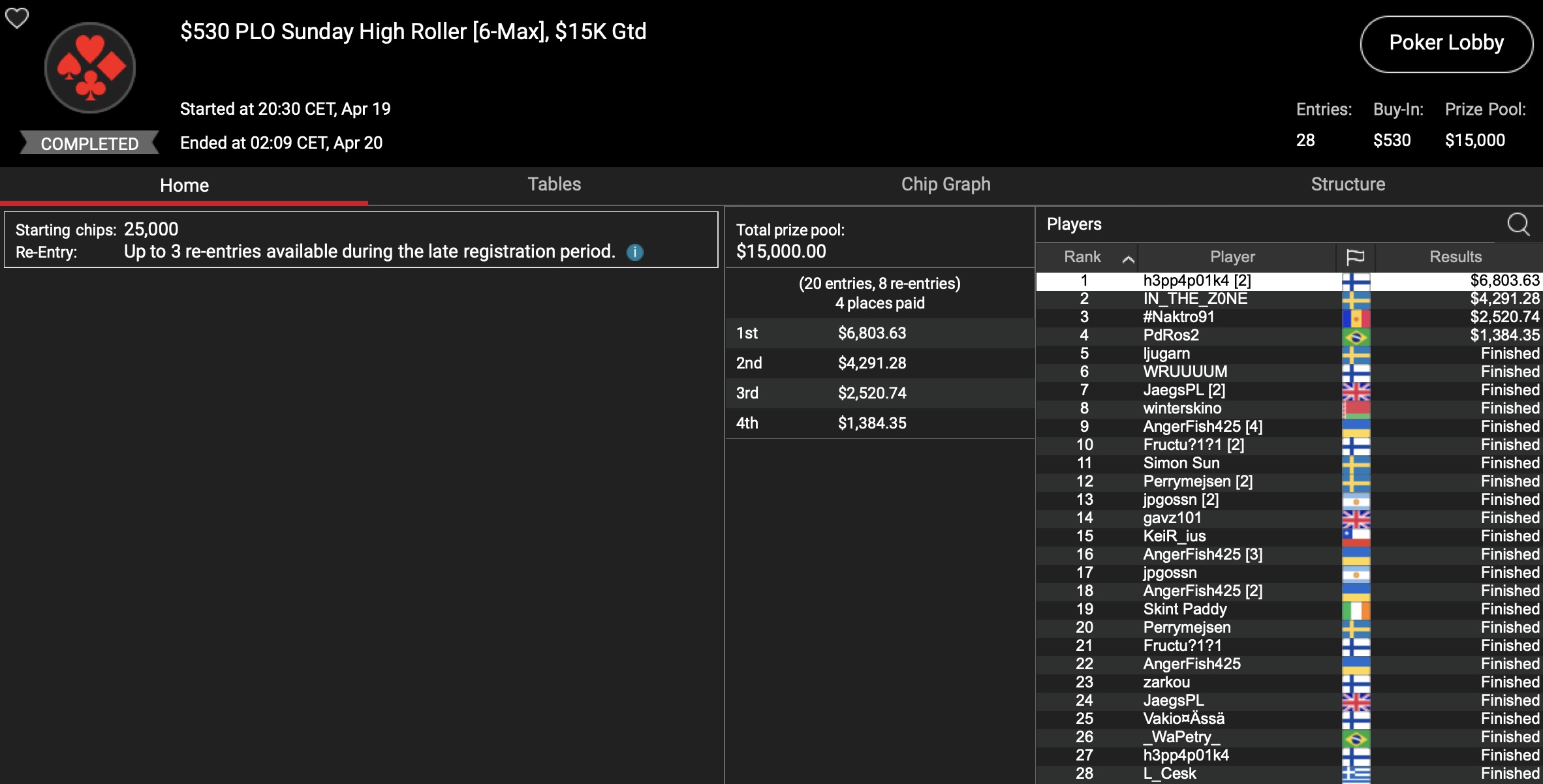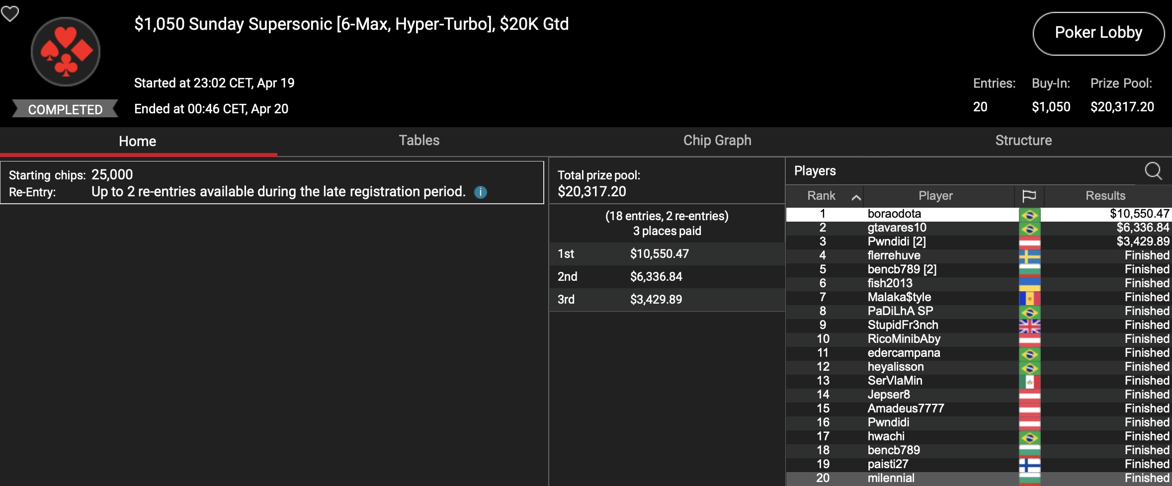 In den High Roller Editionen der Sonntagsevents war es Alex „Pwndidi“ Theologis, der gleich zwei Finaltische einfahren konnte. Im $1.050 Sunday Supersonic belegte der griechische Wahl-Österreicher unter 20 (18+2) Entrys Rang 3, was ihm in dem shorthanded Hyper-Turbo Tournament $3.430 einbrachte. Einen weiteren Final Table gab es für den MTT-„Crusher“Pwndidi“ m $1.050 Sunday High Roller. in dem PKO-MTT belegte er unter 80 (70+10) Entrys Rang 6 ($2.539+$1.187). Im selben Event wurde der Österreicher „Piranha_n1“ für $1.423 Achter, während Benjamin „bencb789“ Rolle im Heads-Up knapp den Turniersieg verpasste. Der Runner-Up-Spot sollte ihn mit $9.439+$1,875 entschädigen. Das platzierungsmäßig beste Resultat für die deutschsprachige Community fuhr „assel007“ im $1.050 Sunday Warm-Up High Roller ein. In der 6-Max Deepstack HR Ausgabe sciherte sich der Deutsche unter 30 (26+4) Entrys den Sieg und damit $12.565 aus dem mit $30k garantierten Preispool.