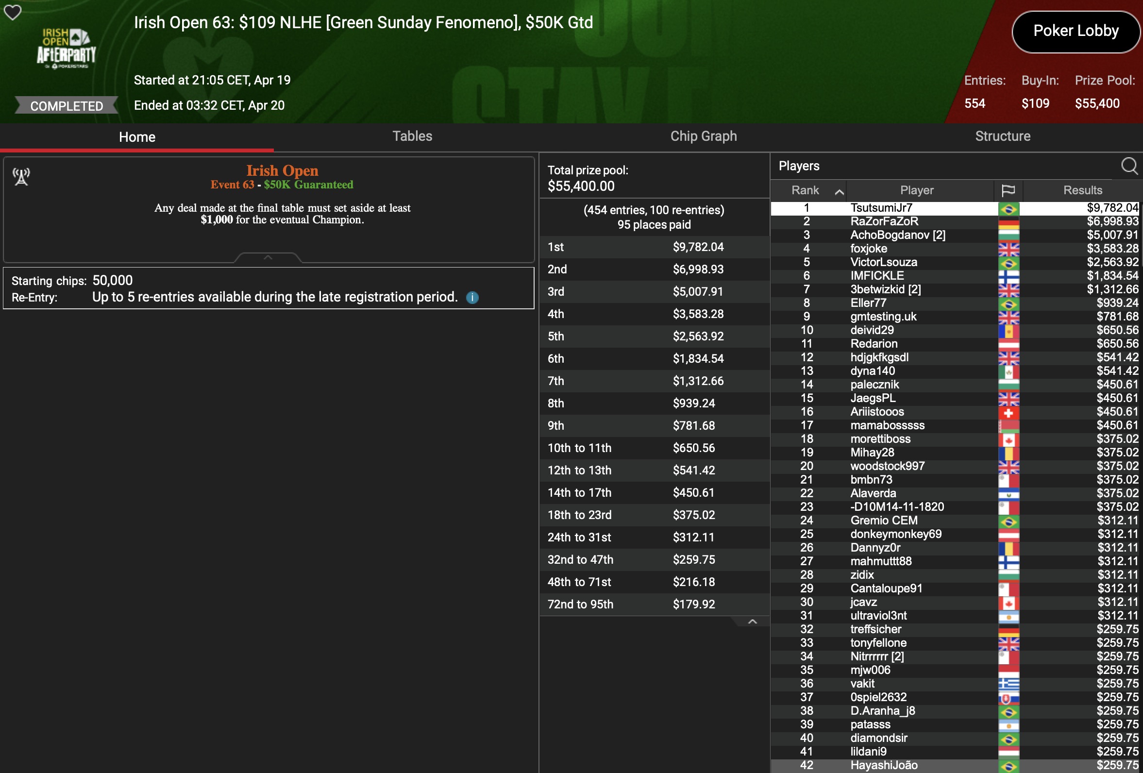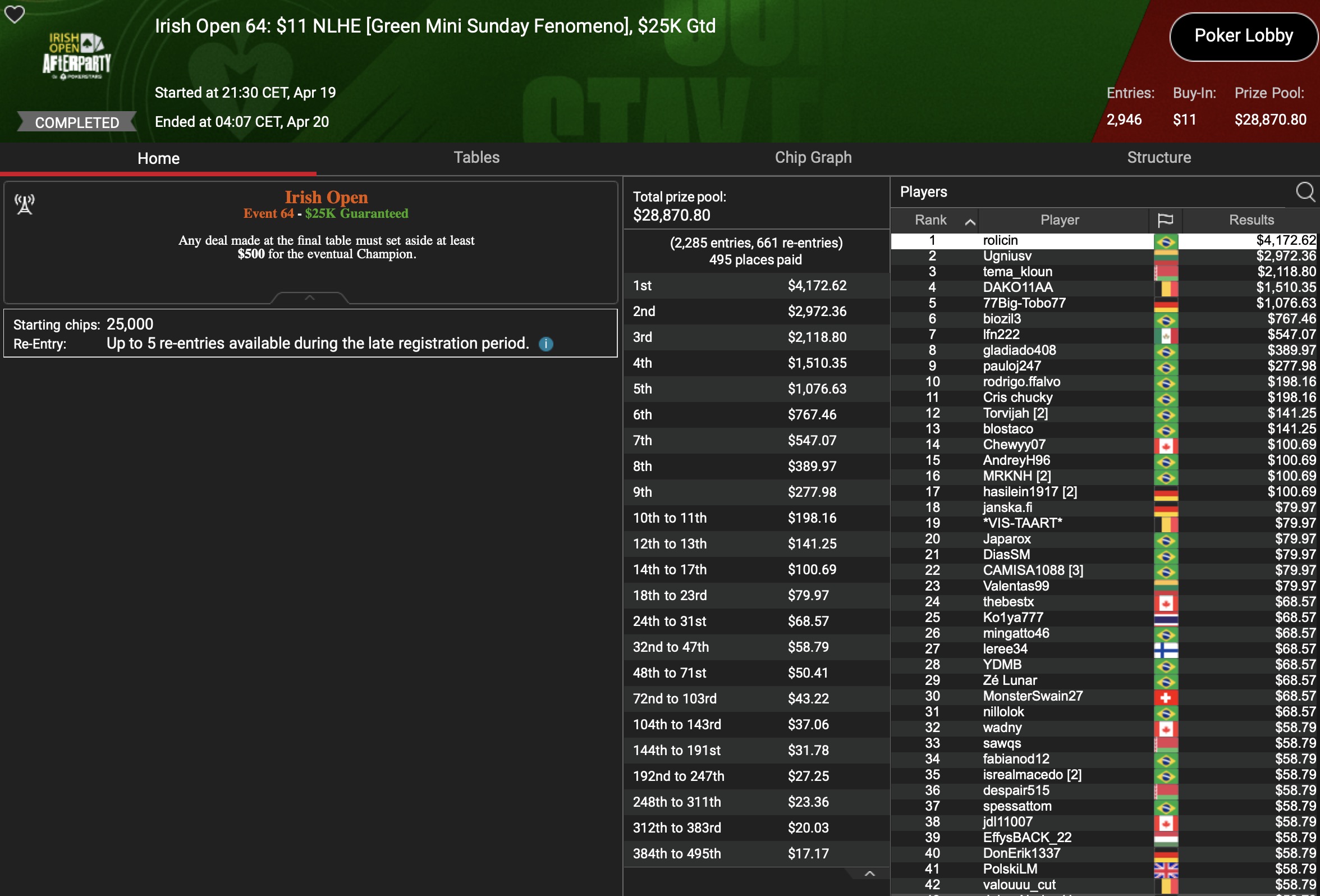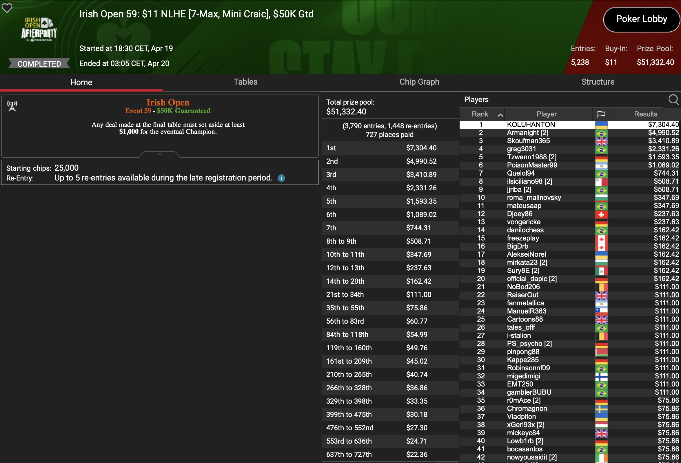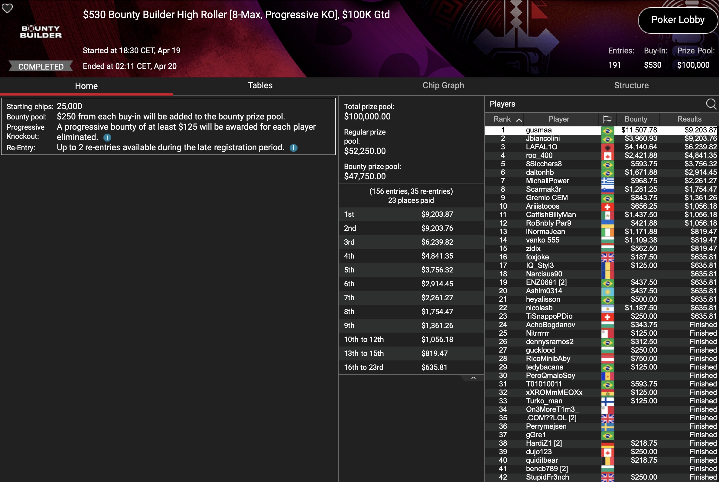 In den High Roller Editionen der Sonntagsevents war es Alex „Pwndidi“ Theologis, der gleich zwei Finaltische einfahren konnte. Im $1.050 Sunday Supersonic belegte der griechische Wahl-Österreicher unter 20 (18+2) Entrys Rang 3, was ihm in dem shorthanded Hyper-Turbo Tournament $3.430 einbrachte. Einen weiteren Final Table gab es für den MTT-„Crusher“Pwndidi“ m $1.050 Sunday High Roller. in dem PKO-MTT belegte er unter 80 (70+10) Entrys Rang 6 ($2.539+$1.187). Im selben Event wurde der Österreicher „Piranha_n1“ für $1.423 Achter, während Benjamin „bencb789“ Rolle im Heads-Up knapp den Turniersieg verpasste. Der Runner-Up-Spot sollte ihn mit $9.439+$1,875 entschädigen. Das platzierungsmäßig beste Resultat für die deutschsprachige Community fuhr „assel007“ im $1.050 Sunday Warm-Up High Roller ein. In der 6-Max Deepstack HR Ausgabe sciherte sich der Deutsche unter 30 (26+4) Entrys den Sieg und damit $12.565 aus dem mit $30k garantierten Preispool.