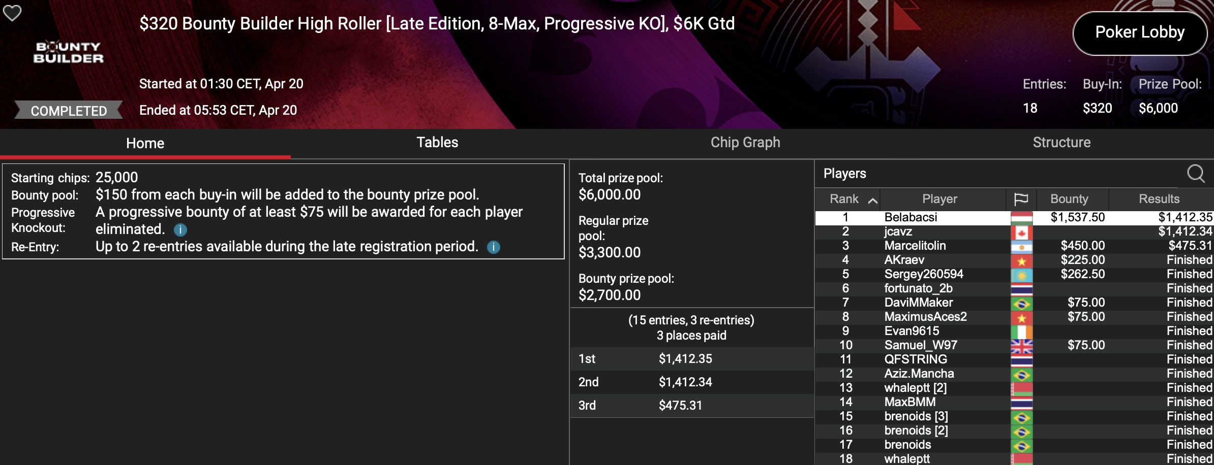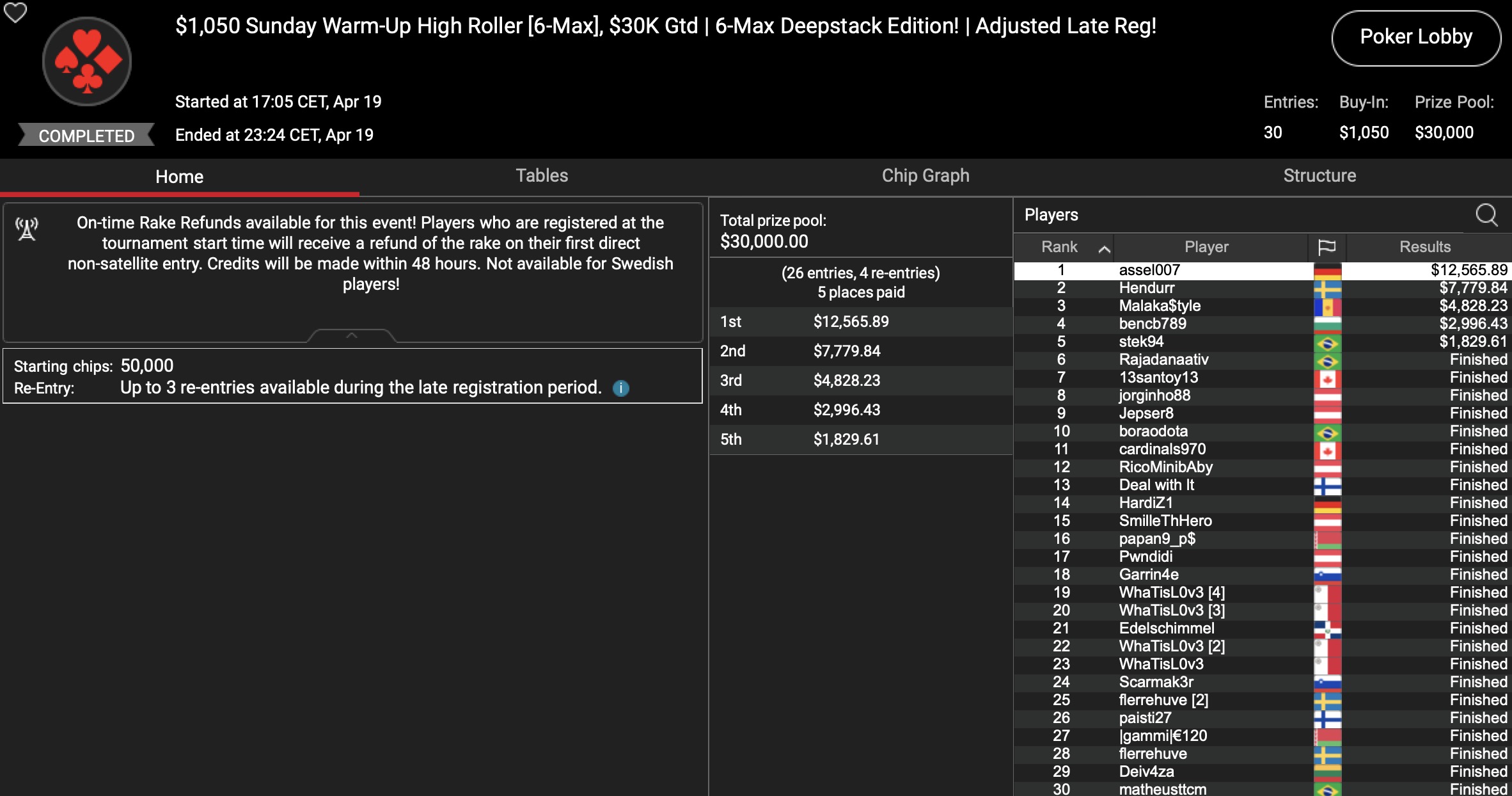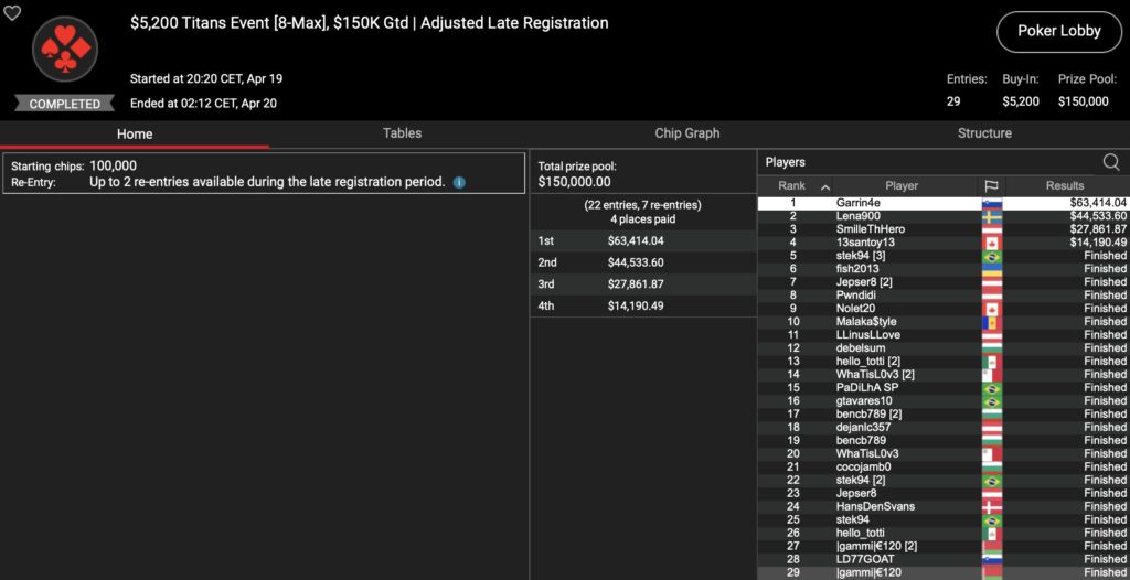 Im teuersten wiederkehrenden Turnier auf PokerStars gingen 22 High Roller an den Start, die mit 9 Re-Entrys dafür sorgten, dass es ein $5k Overlay im mit $150k garantierten Preispool gab. Die Top-4 sollten auf der Jagd nach der $63.414 Siegprämie im Geld landen. Während das anderen deutschsprachigen und internationalen High Rollern in dem stark besetzten Feld nicht gelang, finishte Daniel „SmilleThHero“ Smiljkovic für $27.861 auf Rang 3. Den Vortritt musste er in der Nacht von Sonntag auf Montag lediglich Niklas „Lena900“ Aastedt ($44.533) und Igor „Garrin4e“ Yaroshevsky ($63.414) lassen.