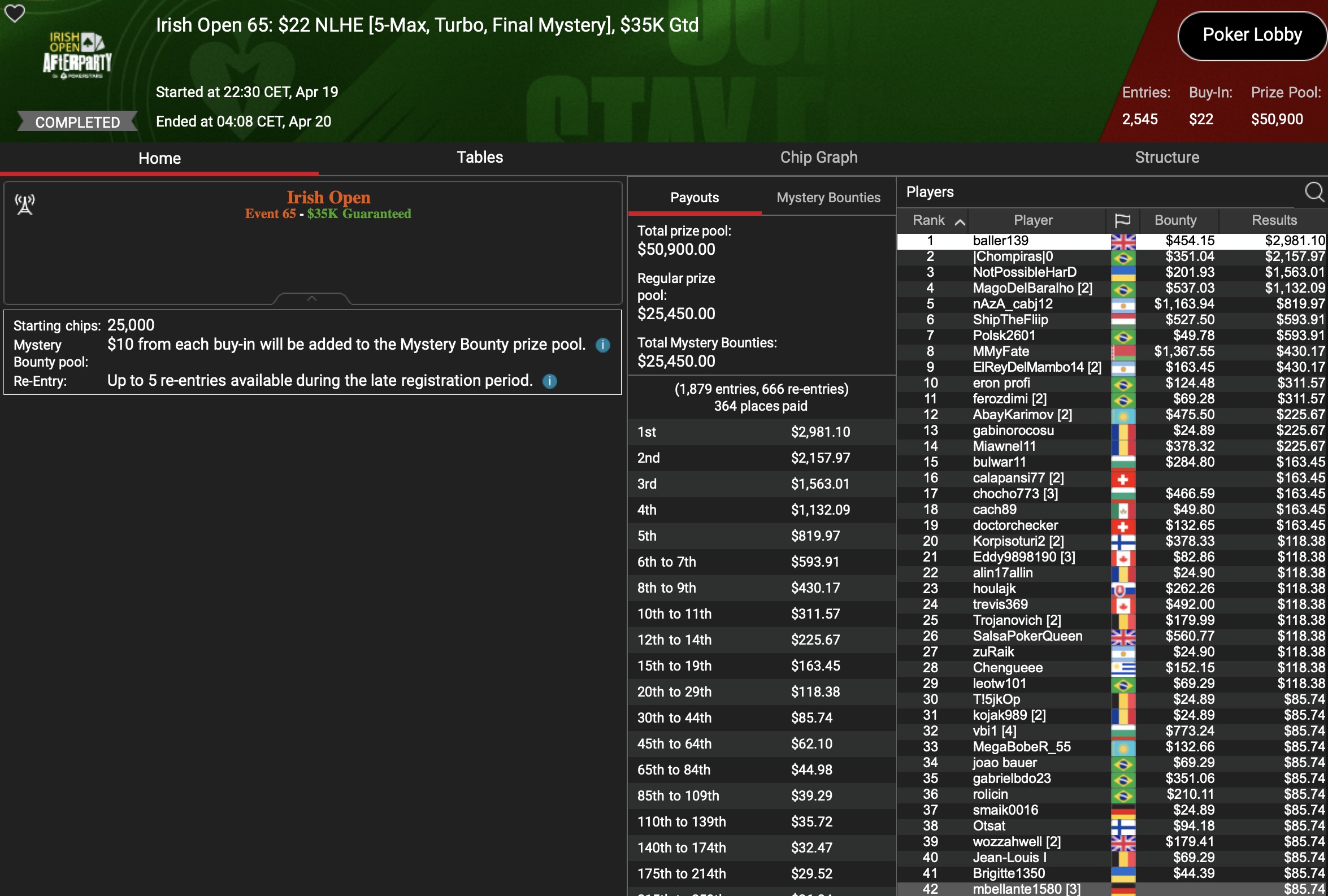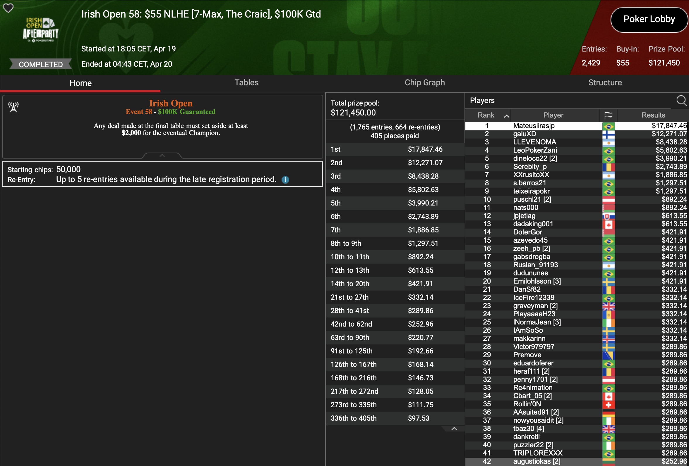 Im Sunday Grind auf PokerStars trafen in den High Roller Events die Üblichen Verdächtigen aufeinander. Auch wenn die Beteiligung und die Erfolge der D-A-CH-L Community gestern überschaubarer waren, gab es einige Erfolge zu vermelden. Dazu gehörte das Podium von Daniel „SmilleThHero“ Smiljkovich im Titans Event und auch der Triumph von „assel007“ im Sunday Warm-Up HR. – Im Rahmen der Irish Open Afterparty wurden am Sonntag 6 Events entschieden.