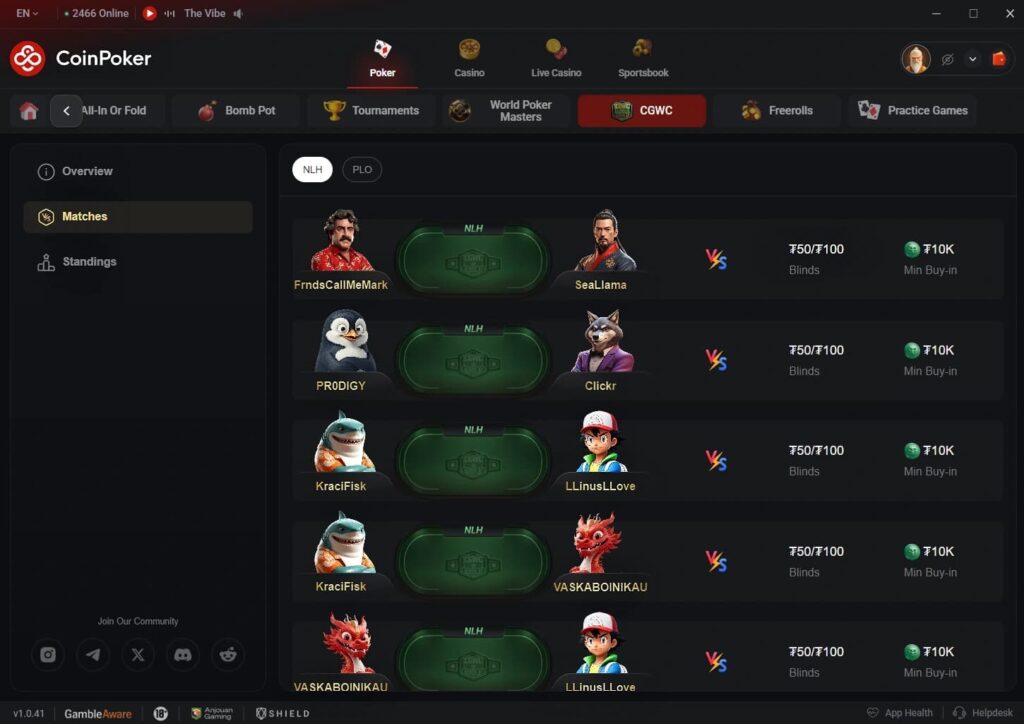 Hautnah dabei seid ihr im CoinPoker Client, wo ihr die Matches unter einem eigenen „CGWC“ Reiter findet. Hier könnt ihr auch als Zuschauer mit an den Tischen Platz nehmen und die Hände so erleben, als wärt ihr selbst im Kampf um die Weltmeisterschaft.