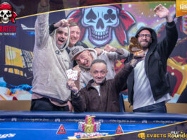 Lars Riedel: Ich bin davon ausgegangen, dass 20-30 Minuten gespielt wird, und dann derjenige mit den meisten Chips am Tisch eine Runde weiterkommt. So war’s dann aber halt nicht. – Und in der ersten halben Stunde hatte ich kein einziges Blatt getroffen. Als ich dann A2 gespielt habe, hab ich dann auch gleich das Ass getroffen, und dachte mir, dass ich den Topf damit ziehen könnte. Dementsprechend hab ich auch Gas gegeben. Jemand anders am Tisch zog dann gleich mit, und ein Dritter auch. Aber ich dachte mir, jetzt musste auch mal reingehen, und die letzten beiden Karten machten bei meinem Gegenüber dann die Große Straße perfekt. Kann passieren.