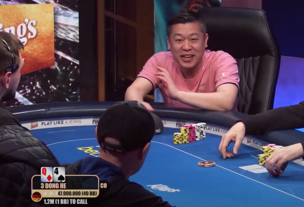 In den ersten der acht Flight starteten am Mittwoch 10 Qaulifikant*innen aus dem vorausgegangenen Satellite und 33 Direkteinkäufer*innen. Währen der Late Reg kamen noch 12 Re-Entrys hinzu, womit feststand, dass an Tag 1A am Ende 9 Spieler*innen (15%) ITM und 6 (10%) in Tag 2 landen sollten. 5 Teilnehmer*innen aus der D-A-CH-L Region sollten die €250 Min-Cash auf ihrer King’s Card verbuchen können, 4 von ihnen werden wir sicher an Tag 2 wiedersehen. Dazu gehörte neben „Lucky Lolek“ (GER, 140.000), Rasso Gensmantel (GER, 196.000) und Holger Gundlach (GER, 296.000) auch ihr Landsmann Dong He (GER). Der erfahrene MTT-Crusher durchbrach als einziger die Millionenschallmauer und konnte mit 1.016.000 den Chiplead und damit auch die €1.150 Prämie erlangen.