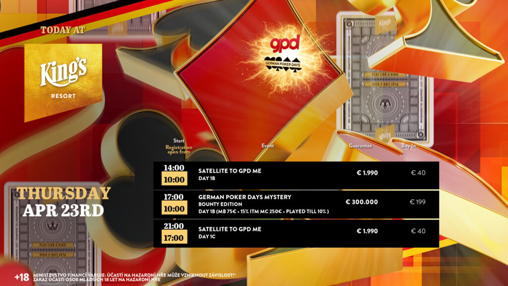 Am Mittwoch fiel im King’s Resort Rozvadov der Startschuss zu den German Poker Days powered by GPD. Das beliebte Event ist diesmal als GPD Mystery Bounty Edition mit €300.000 Garantie aus Osnabrück zu Besuch in den Pokerroom King’s gekommen. Bereits an den Starttagen des Main Events geht es nicht nur um das Erreichen des Preisgelder und das Weiterkommen in Tag 2, sondern auch immer um einen €1.150 Chipleader Bonus für den fleißigsten Jeton-Sammler des Tages, und das sollte an Tag 1A kein Unbekannter sein!