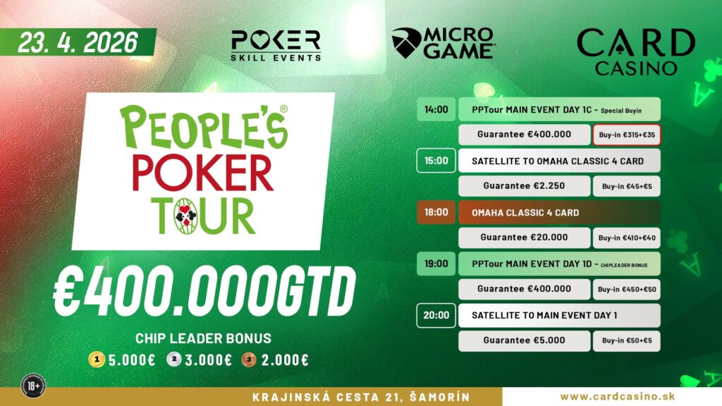 Ab 18:00 Uhr waren am Mittwoch im Card Casino Samorin (vormals Card Casino Bratislava) die Karten im Flight 1B vom PPTour Main Event wieder in der Luft. Wer um die garantierten €400.000 im Main Event der Peoples Poker Tour powered by Poker Skill Events und Micro Game spielen wollte, hatte zum zweiten Mal die Gelegenheit das zum Schnäppchenpreis zu tun. Denn an den ersten 3 der 10 Starttagen gibt es einen Special BuyIn Price, der von €500 auf nur noch €350 reduziert ist.
