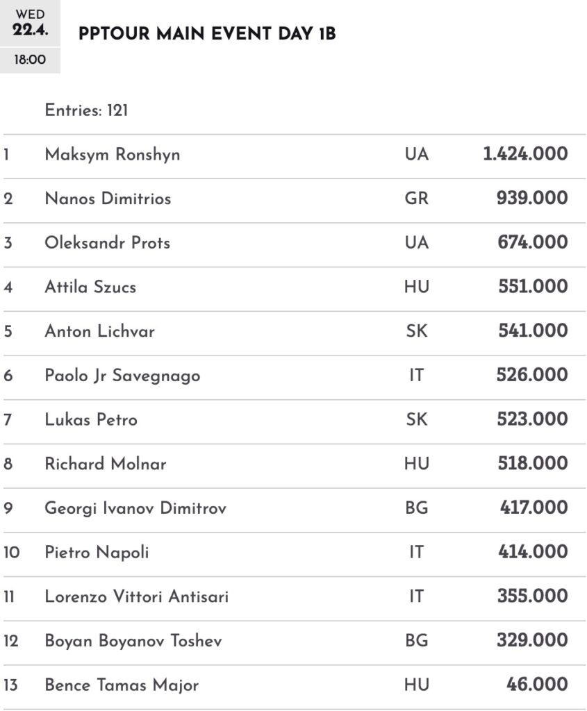 Hatten am Vortag noch 7 deutschsprachige Spieler den Cut geschafft, so gab es an Tag 1B gar keinen Überlebenden aus der D-A-CH-L Region. Dagegen sollte sich am Mittwoch wieder ein Grieche unter den Top-Counts befinden. Nachdem Konstantinos Nanos seinen Flight 1A als Chipleader abgeschlossen hatte, war es Nanos Dimitrios, der den Flight mit 939.000 Chips als 2nd Chipleader beendete. Den Vortritt musste er nur Maksym Ronshyn aus der Ukraine lassen, der sich mit 1.424.000 erspielten Jetons zum neuen Overall Chipleader aufschwang. Das Chipcount-Podium komplettierte Pleksandr Prots aus der Ukraine mit 674.000 Chips, gefolgte von Attila Szucs (HUN) und Anton Lichvar (SVK) mit 551.000er bzw 541.000er Stacks.