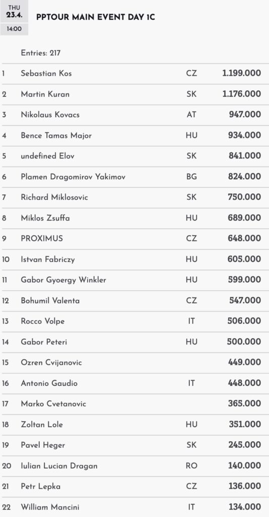 Unter den 22 Überlebenden schaffte auch ein deutschsprachiger Spieler den Cut, und das auf einem der vordersten Plätze der Tageswertung. Der „Kovinator Niko Kovacs aus Österreich baute seinen 60.000er Starting Stack auf hervorragende 947.000 Chips aus und konnte damit seine Chiptüte am drittvollsten packen. Größere Stacks konnten lediglich noch Martin Kuran (SVK) mit 1.176.000 und der Tag-1C-Chipleader Sebastian Kos (CZE) mit 1.199.000 Jetons einpacken.