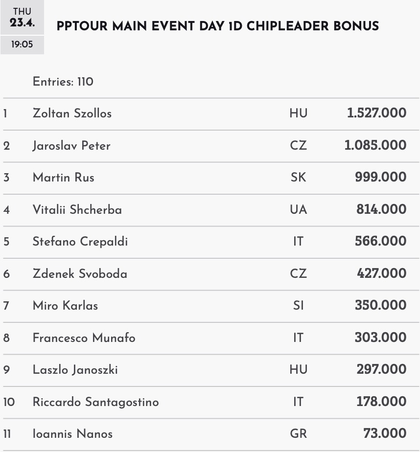 Kanpp an den Bonus Payouts vorbei segelte das ukrainische MTT-Phänomen Vitailii Shcherba, der es als Vierter auf 814.000 brachte. Den Kampf um einen der Chipleader Boni konnte Martin Rus (SVK) erfolgreich bestreiten, der zwar mit 999.000 erspielten Chips haarscharf die Millionengrenze verpasste aber auf Rang 3 der Tageswertung €2.000 Bonus kassierte. Für Jaroslav Peter (CZE) machten sich 1.085.000 erspielte Jetons mit €3.000 Bonus bezahlt und als Chipleader und mit dem Top-Payout von €5.000 konnte Zoltan Szollos (HUN) mit 1.527.000 Chips übernachten, die ihn auch zum Overall Chipleader machten.