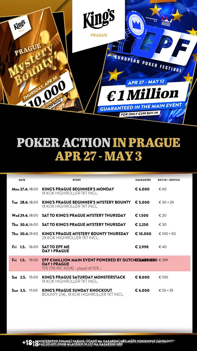 Der Preispool ist mit €300.000 garantiert, von dem 16% für Steuer und Fee abgezogen werden müssen. Im Preispool enthalten sind 10 Packages à €3.000 für die King’s Million European Poker Championship (KM EPC) im Herbst.