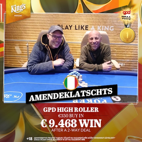 24 Spieler erhielten einen Anteil davon und nach einen Heads-up Chop erhielten sowohl der deutsche Spieler ‚Daagobert‚ und der Italiener ‚Amendeklatschs‚ jeweils €9.468.