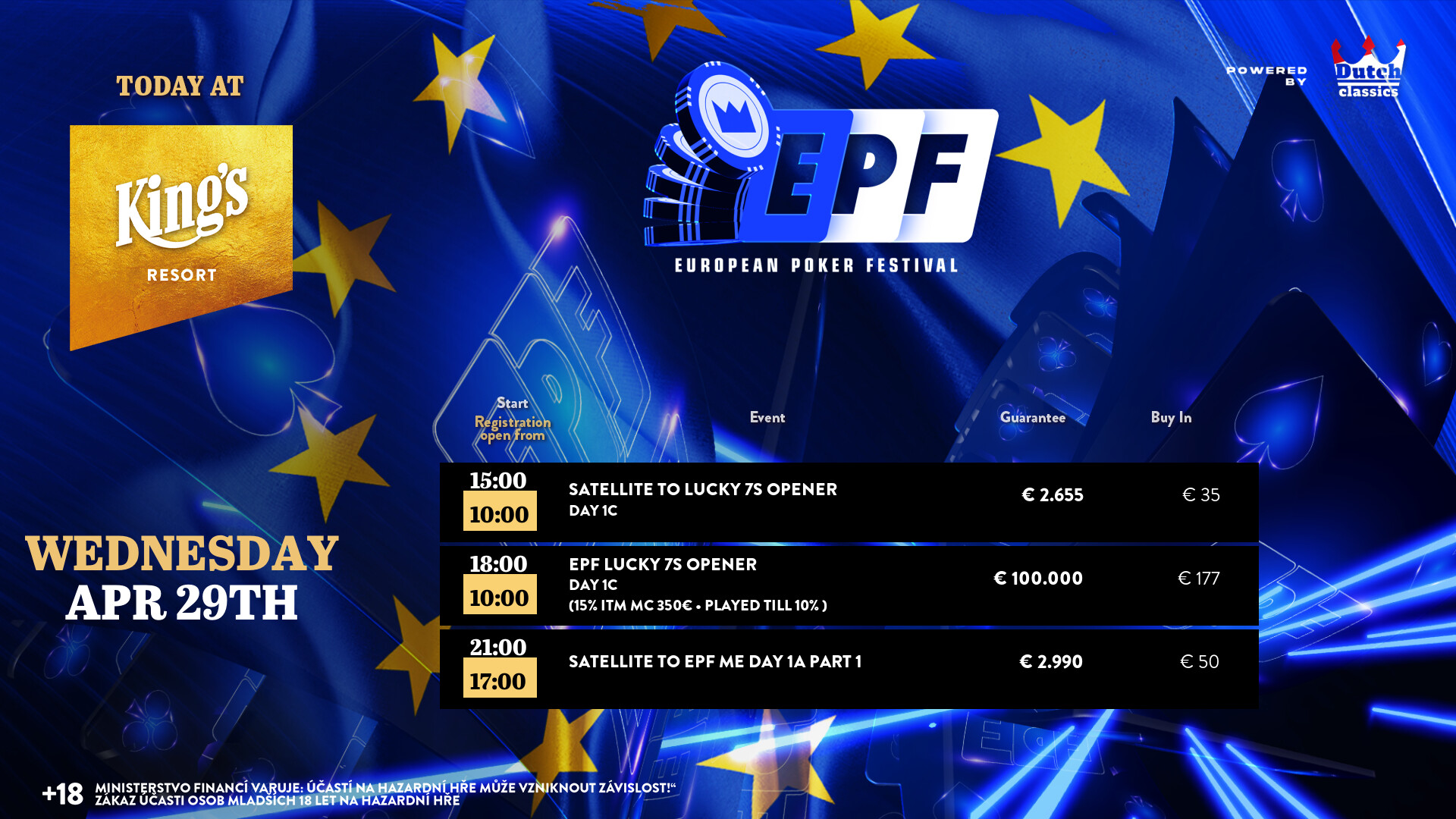 Im King’s Resort wurde gestern der zweite Flight des Lucky 7s Opener des European Poker Festival (EPF), powered by Dutch Classics & Pokerreis gezockt – und auch im King’s Casino Prag gab es mit dem Beginner’s Mystery Bounty ebenfalls Action!