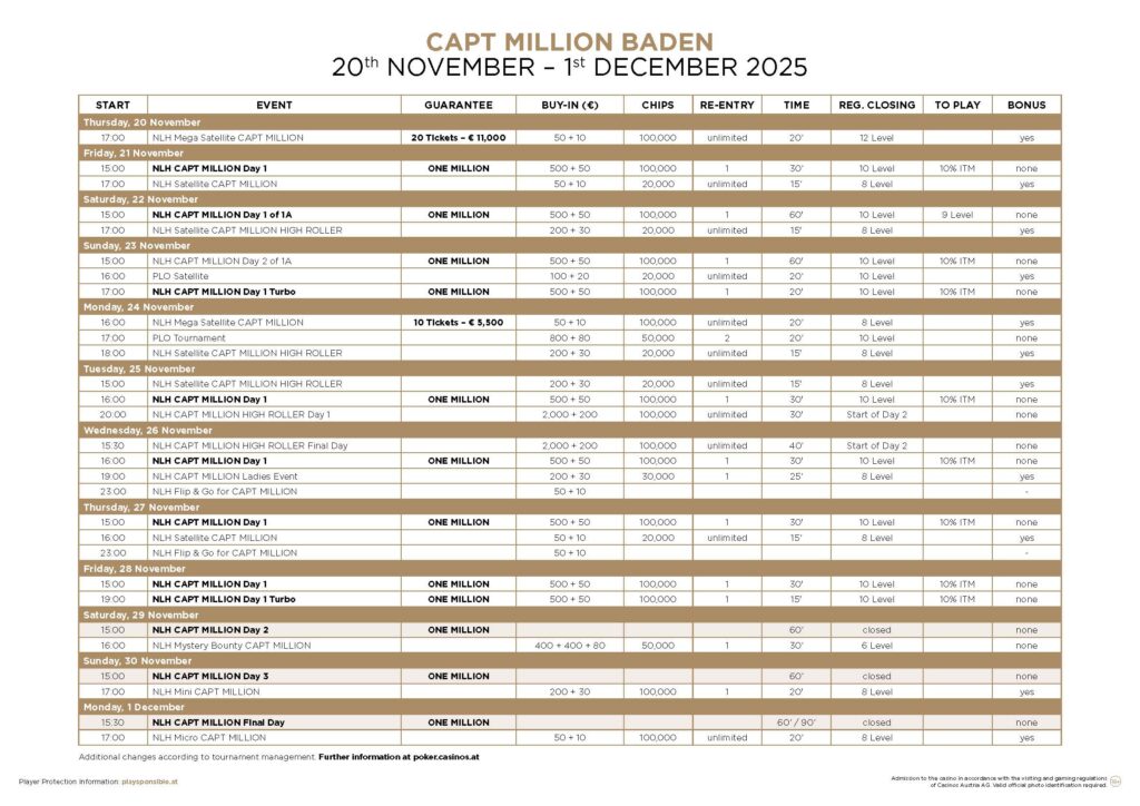 | 14. Nov | 17:00 | Linz | CAPT Million Day 1A | € 500 + 50 | € 1 Mio |