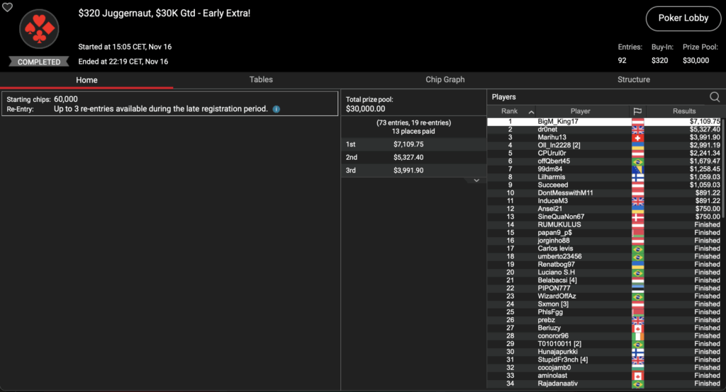 Im $320 Juggernaut ($30k GTD) konnte direkt ein österreichischer Sieg verzeichnet werden. Das Event fand 92 Entries und somit reichte es nicht aus, die $30.000 Garantie zu überschreiten. Der Österreicher ‚BigM_King17‘ nahm hier den Top-Preis von $7.109 mit nach Hause.