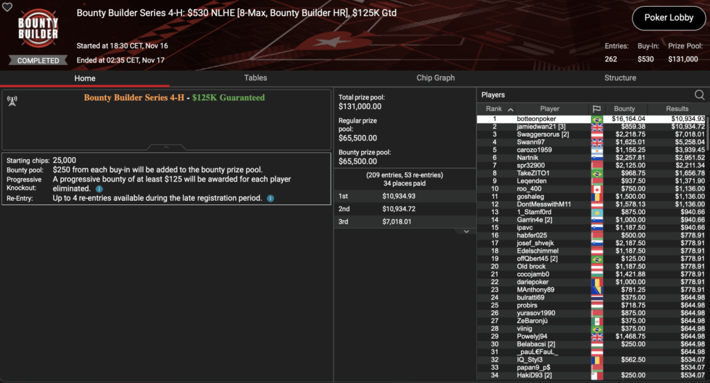 Das Bounty Builder Series 4-H: $530 NLHE Bounty Builder High Roller ($125k GTD) konnte 262 Entries verzeichnen und somit wurde ein Preispool von $131.000 generiert. Hier gab es Bronze für Österreich für den in Wien lebenden Briten Jack ‚Swaggersorus‘ Sinclaire. Platz 3 verschaffte ihm eine $7.018 Auszahlung plus $2.218 an Bounties.