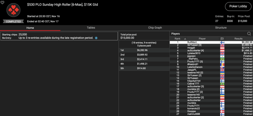 18 4-Karten-Liebhaber meldeten sich für das $530 PLO Sunday High Roller ($15k GTD) an und bezahlten für zusätzliche neun Re-entries. Damit wurde die Garantie nicht geknackt und es wurde um $15.000 gespielt. Fünf Spieler waren im Geld und zwei davon kamen aus Österreich. ‚aufzuckerter‚ beendete das Turnier auf Platz 4 für $1.498 und ‚moggiii‚ erreichte den dritten Platz für $2.414.