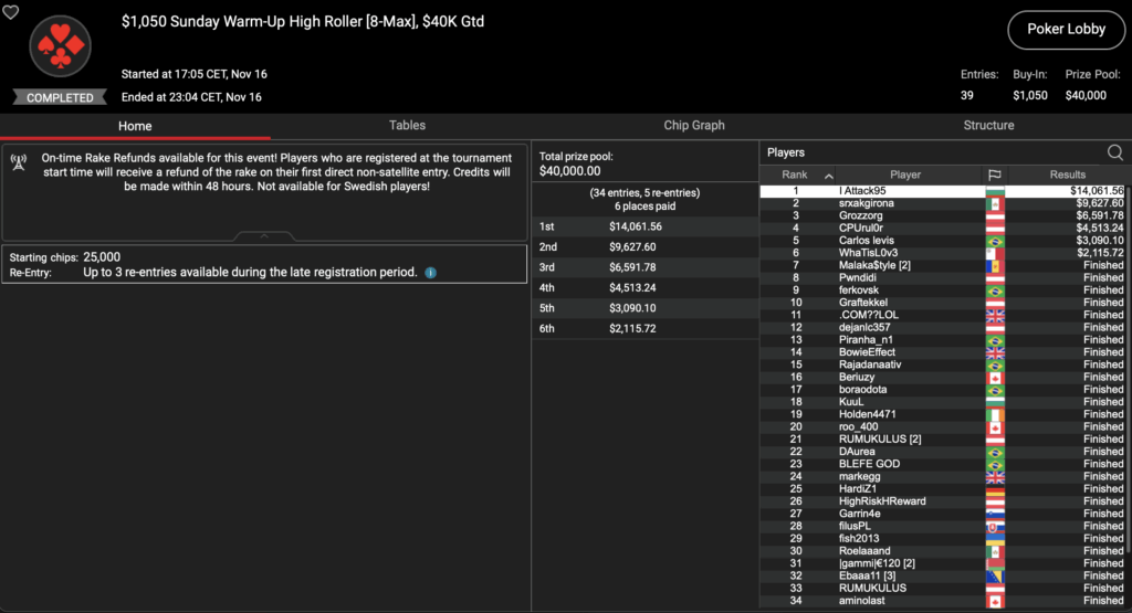 Und zu guter Letzte in der Reihe von Poker-Stars Events haben wir das $1.050 Sunday Warm-up High Roller ($40k GTD). Auch hier gab es einen dritten und vierten Platz für Österreich. 39 Spieler waren nicht genug für die Garantie und somit wurde um $40.000 gespielt. Auf Platz 4 nahm ‚CPUrul0r‚ $4.513 und auf Platz 3 nahm Leonard ‚Grozzorg‘ Maue $6.591 mit nach Hause.