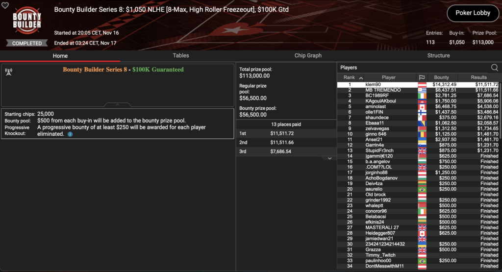 Im Bounty Builder Series 8: $1,050 NLHE High Roller Freezeout ($100k GTD) wurde Gold heimgefahren. Das Turnier hatte 113 Anmeldungen und somit einen $113.000 Preispool. Der Top-Preis von $11.511 plus die $14.312 für Bounties gingen an niemand Geringeren als den Österreicher Klemens ‚klem90‘ Roiter.