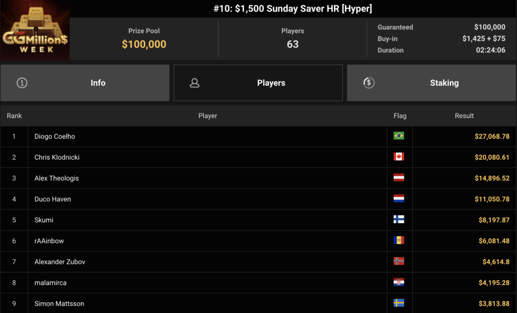 Im $1.500 Sunday Saver High Roller ($100k GTD) meldeten sich 63 Spieler an und es reichte nicht aus, um die $100k Garantie zu knacken. Hier fanden wir den in Österreich lebenden Griechen Alex Theologis auf Platz 3 für eine $14.896 Auszahlung. Es wurde gerade eine interessante Doku über sein Grinder-Leben von GGPoker veröffentlicht.