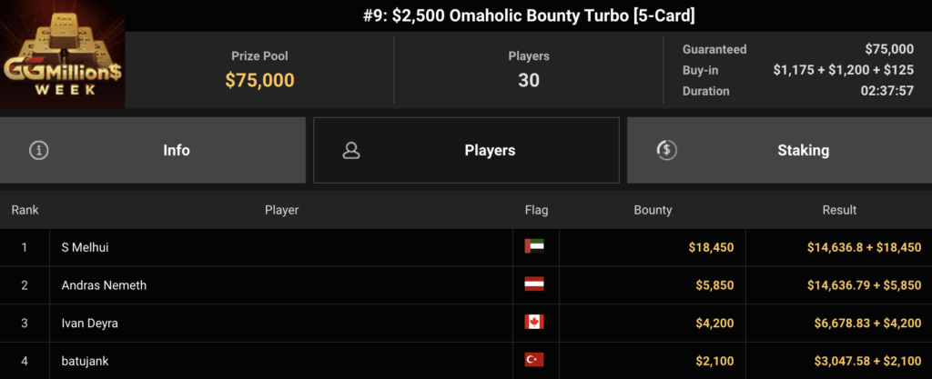 Das $2.500 Omaholic Bounty Turbo ($75k GTD) fand 30 Entries und so wurde auch hier die Garantie nicht erreicht. Hier gab es Silber für einen weiteren „Fake“-Österreicher. Der Ungare Andras Nemeth beendete das Turnier als Runner-up und erhielt dafür $14.636 plus $5.850 an Bounties.
