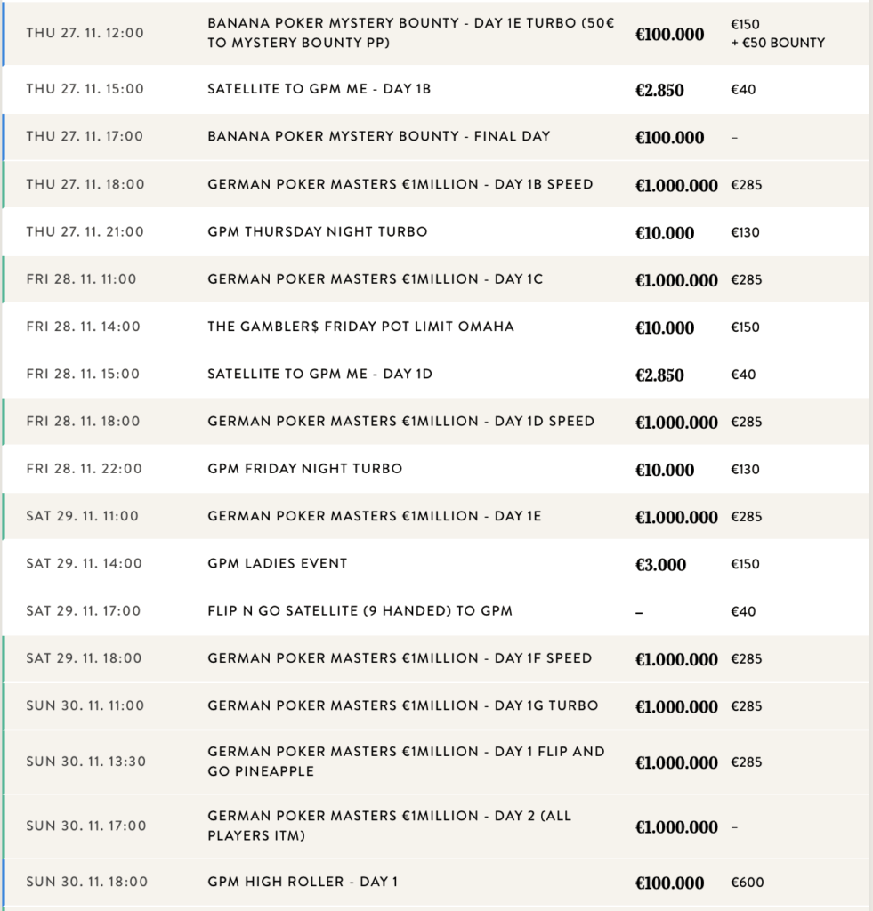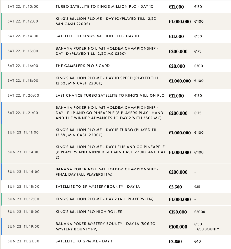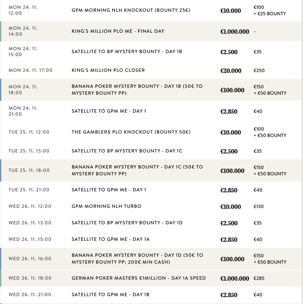 Das Turnier bietet insgesamt fünf Starttage und ein Flip & Go. Der Tag 2 findet morgen um 17:00 Uhr statt und das Finale wird am Montag ausgetragen. €1.000.000 werden in diesem legendären Pot-Limit Omaha Event garantiert und der Min-Cash von €2.200 wird direkt am Ende der Starttage auf die Spielerkonten ausgezahlt.