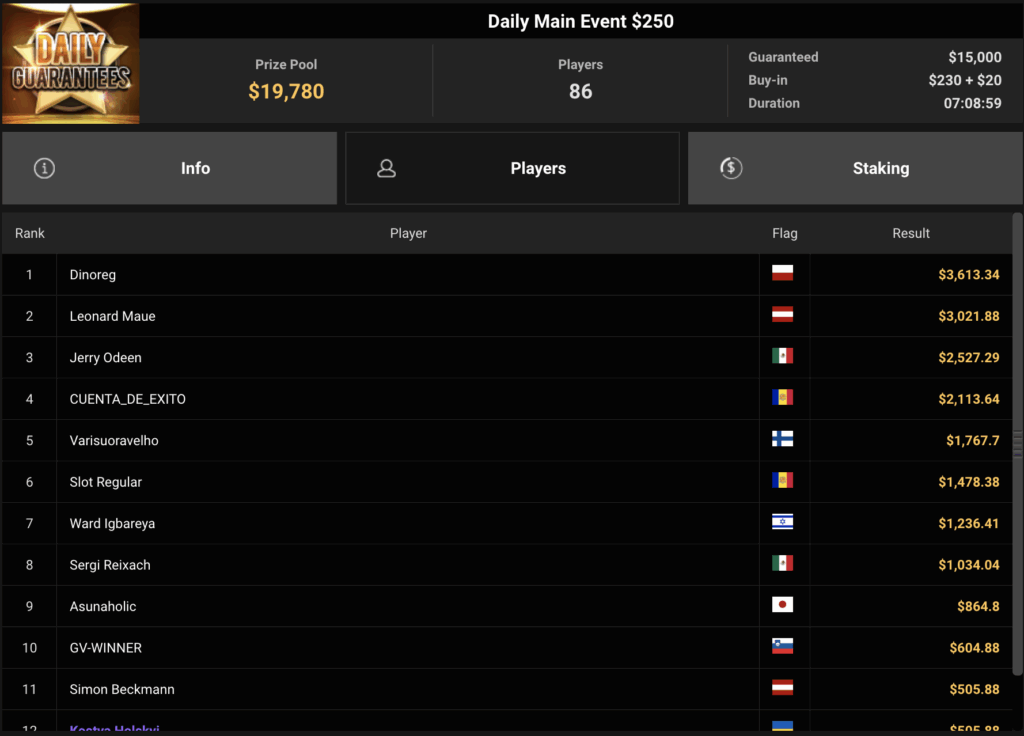 Leonard Maue konnte auch auf GGPoker auftrumpfen. Hier wurde er Zweiter im $250 Daily Main Event ($15k GTD) für $3.021. 86 Entries hatten einen $19.780 Preispool geschaffen und der Sieger war ‚Dinoreg‘ aus Polen für $3.613.