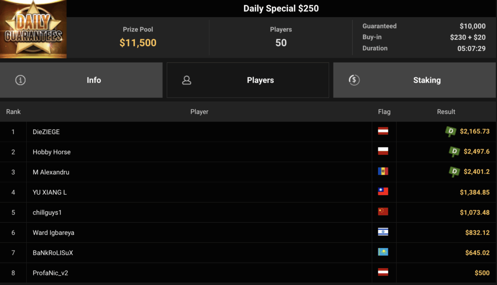 Das $250 Daily Special ($10k GTD) sah 50 Entries und somit einen $11.500 Preispool. Nach einem 3-way Deal war es der Österreicher ‚DieZIEGE‚, der offiziell als Sieger für $2.165 gefeiert werden konnte.