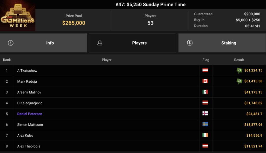 Im $5.250 Sunday Prime Time ($200k GTD) meldeten sich 53 Spieler an und es gab einen $265.000 Preispool. Nach einem Heads-up Deal war es der unter österreichischer Flagge spielende Alex Tkaschew, der für den Sieg $61.224 erhielt. Die größte Auszahlung ging allerdings an den Kanadier Mark Radoja mit $61.415.