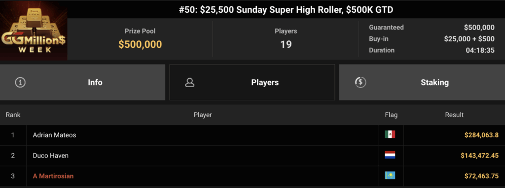 Das größte Event im Online Poker am Sonntag war das $25.500 Sunday Super High Roller ($500k GTD). 19 Teilnahmen bedeuteten ein kleines Overlay. Der in Mexiko lebende Spanier Adrian Mateos staubte hier den Top-Preis von $284.063 ab.