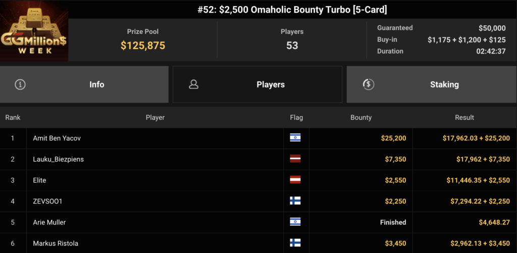 Der österreichische Spieler ‚Elite‚ wurde Dritter im $2.500 Omaholic Bounty Turbo ($50.000 GTD) für $11.446 plus $2.550 an Bounties. Hier kam bei 53 Entries ein $125.875 Preispool zusammen und der Sieger Amit Ben Yacov aus Israel erhielt dafür $17.962 plus $25.200 an Bounties.