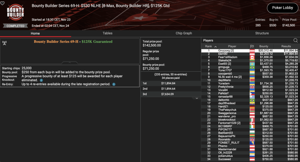 285 mal wurde sich für das Bounty Builder Series 69-H: $530 NLHE Bounty Builder High Roller ($125k GTD) eingekauft, was einen Preispool von $142.500 ergab. Im Heads-up saßen sich zwei Österreicher gegenüber mit Klemens ‚klem90‘ Reuter und Leonard ‚Grozzorg‘ Maue. Letzterer entscheid das Turnier für sich und strich dafür $11.894 plus saftige $20.312 für Bounties ein.