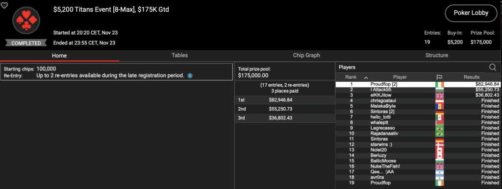 Das größte Event am Sonntag auf PokerStars war das $5.200 Titans Event ($175k GTD). Es waren nur 19 Entries, die für dieses Turnier verzeichnet werden konnten und somit reichte es nicht aus, um die Garantie zu knacken. Keine Österreicher schafften es ITM, aber wir möchten doch berichten, dass der Ire ‚Proudflop‚ hier den Sieg heimfahren konnte für $82.946.