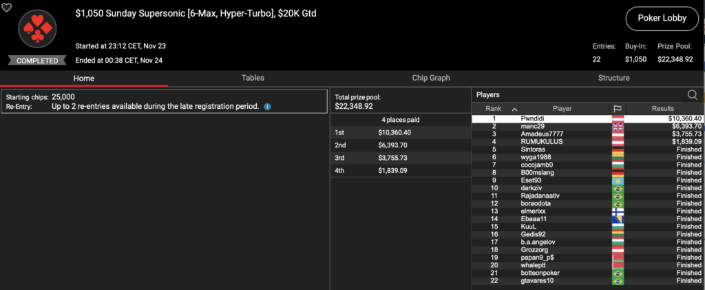 Im $1.050 Sunday Supersonic ($20k GTD) gab es 22 Anmeldungen und somit einen $22.348 Preispool. Dieser wurde auf die Top 4 Spieler verteilt und drei davon spielten unter österreichischer Flagge. Als Sieger konnte sich der in Wien lebende Grieche Alex ‚Pwndid‘ Theologis etablieren und dafür $10.360 mit nach Hause nehmen.