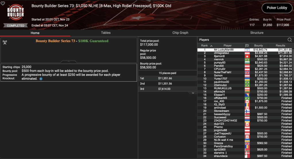 Das Bounty Builder Series 73: $1.050 NLHE High Roller Freezeout ($100k GTD) fand 117 Teilnehmer und somit wurde ein Preispool von $117.000 geschaffen. Der Argentinier ‚Mr.LuckyMan88‚ schlug hier den unter österreichischer Flagge spielenden ‚chrisgoataui‘ für $11.351 plus $16.843 an Bounties.